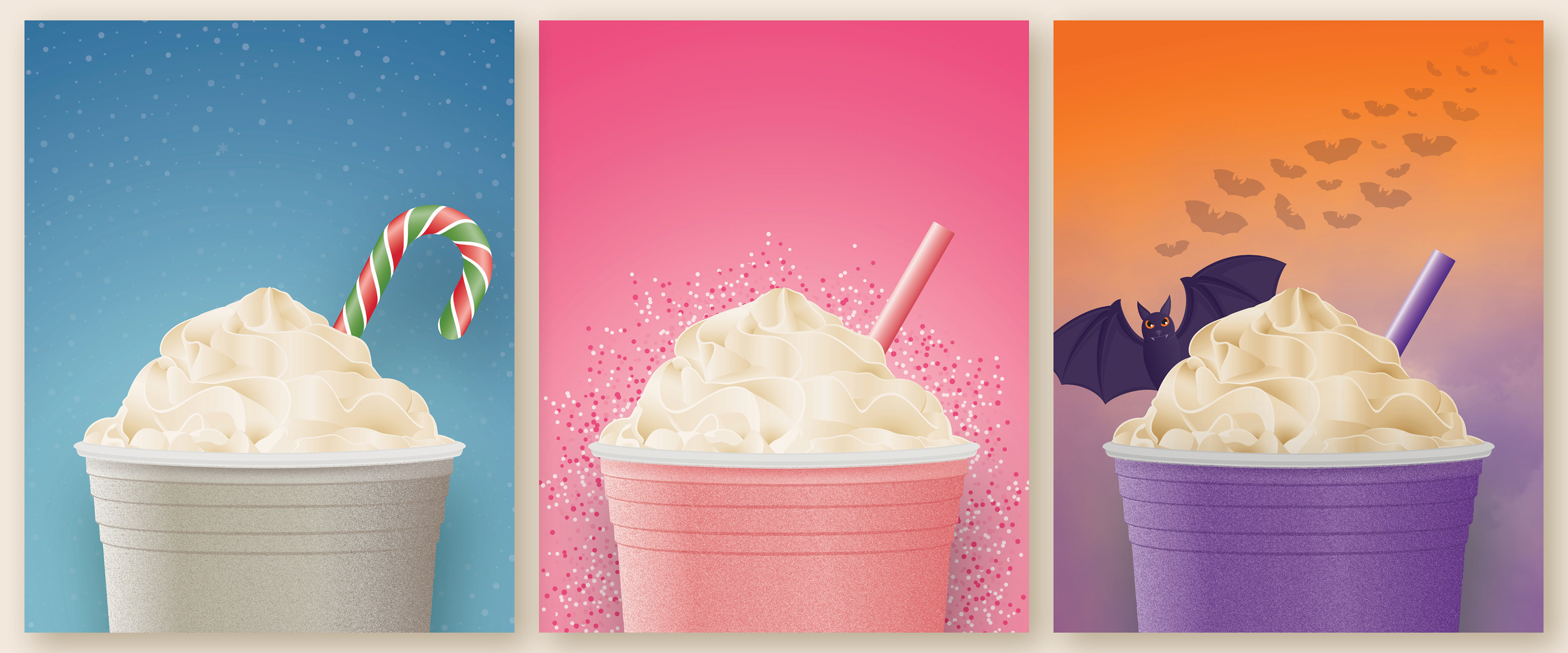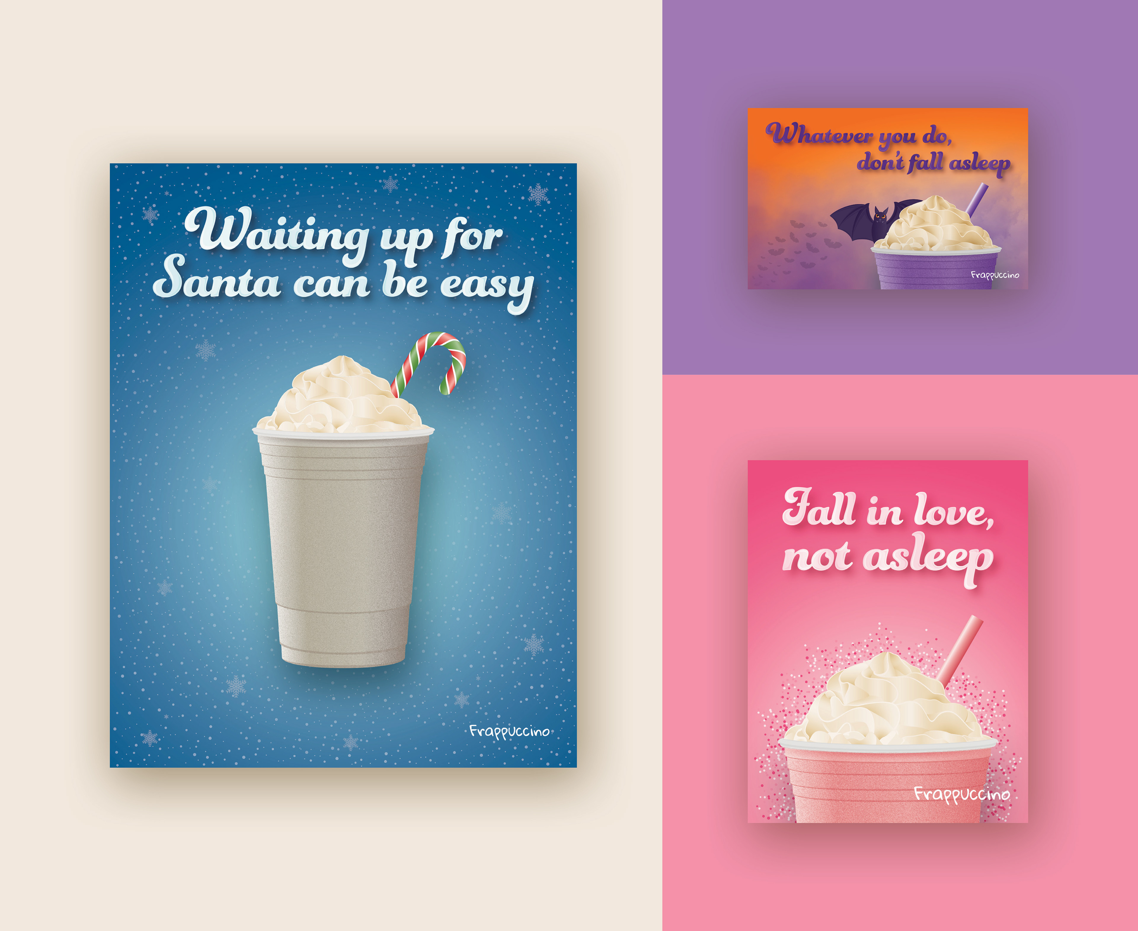 I designed a set of Frappuccino ads relating them to Christmas, Halloween and Valentine’s Day. I’m very happy with how it all came together. I especially enjoyed designing and implementing different gradients to the whipped cream.