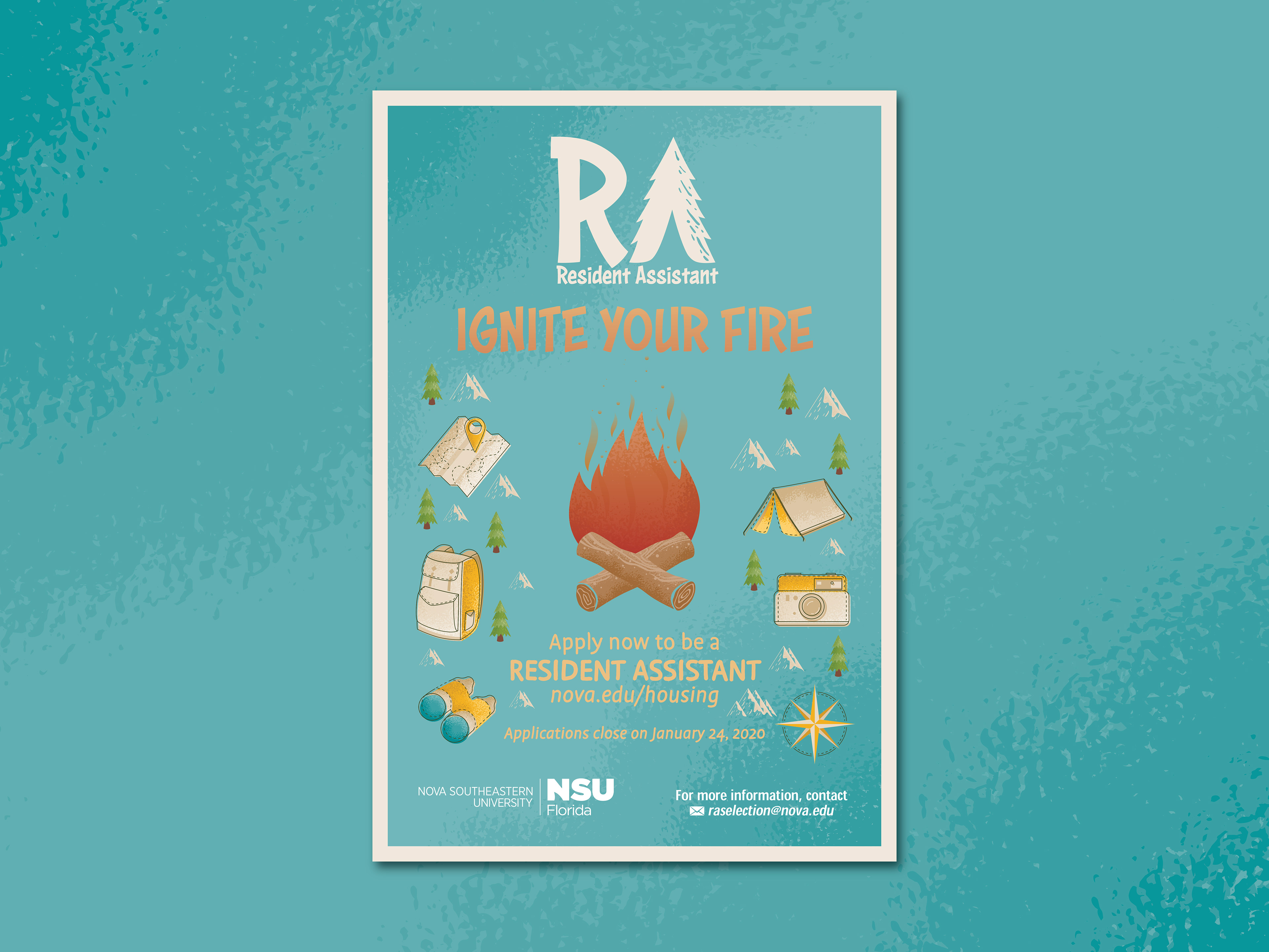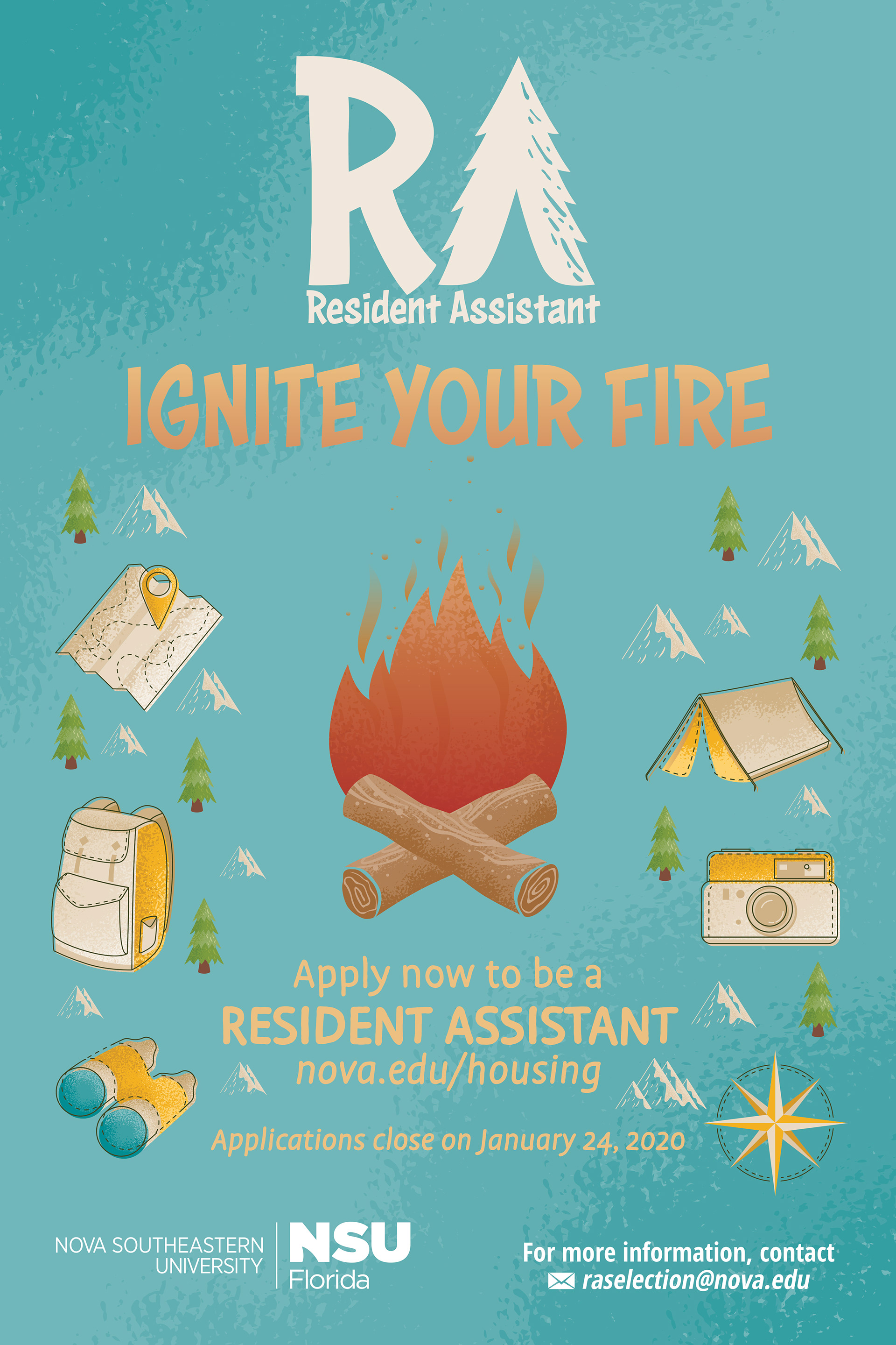 Here's the poster and illustrations I designed for NSU to apply to become an RA! Their theme this year was camping, which is why I created custom illustrations for them to fit their theme.